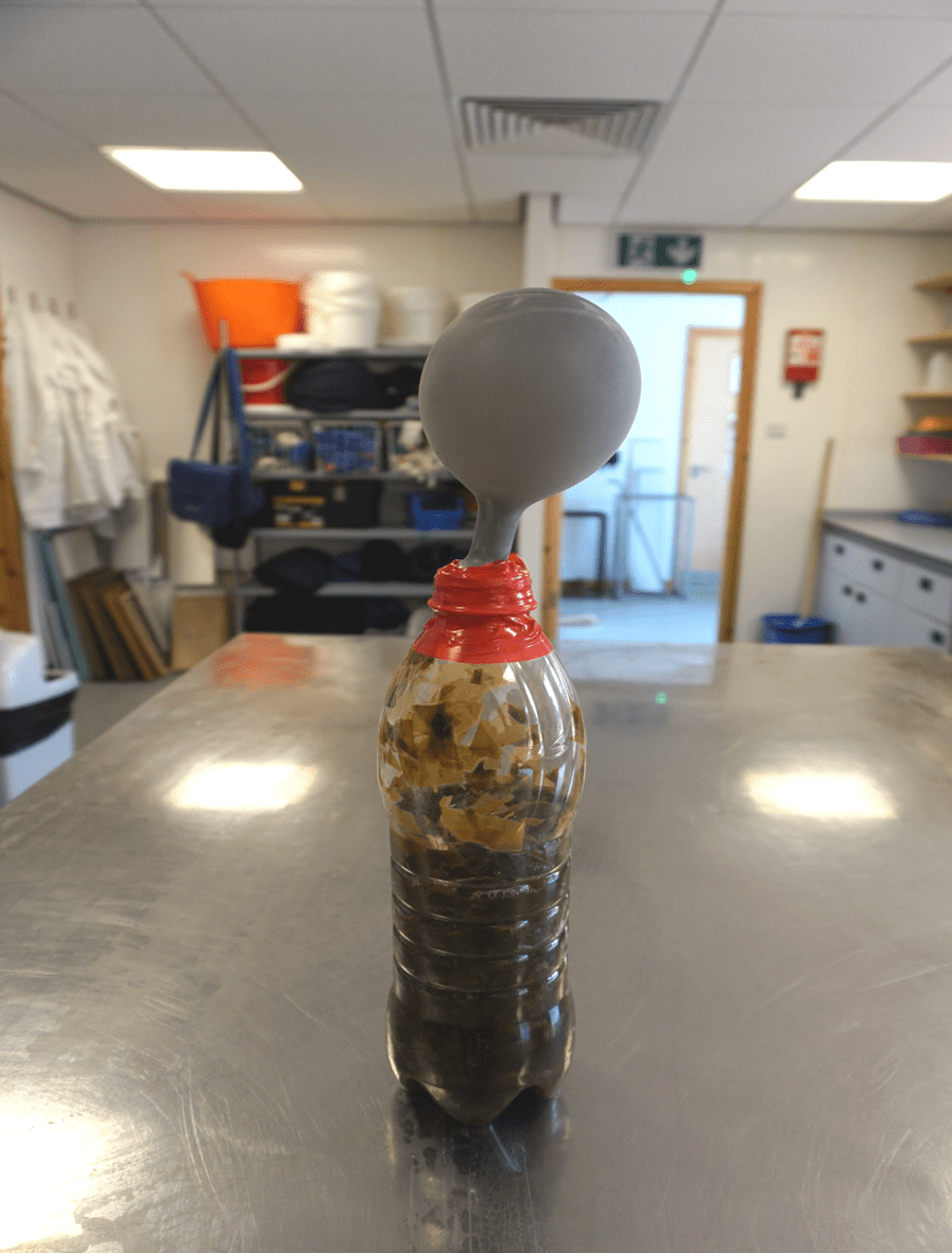 BIOGAS is made up of methane and carbon dioxide which can be used as a renewable source of fuel or turned into electricity and heat. Seaweed is a great material for making BIOGAS as seaweed farming is environmentally sustainable, but you can also give it a try with grass cuttings or food waste. You can also try changing the conditions in which you make your BIOGAS, try putting it in a sunny spot or dark cupboard, a warm or cold place- what happens?