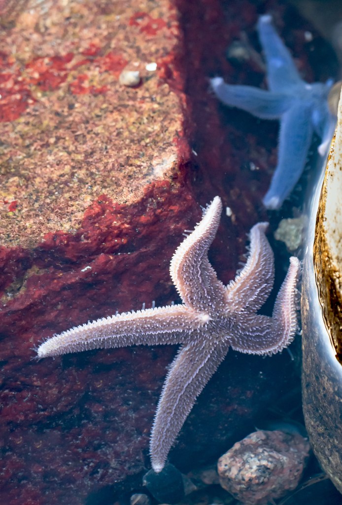 Common Starfish (Asterias rubens)- Very abundant species in Shetland but scarce in rockpools except for occasional juveniles in low tide areas. Adults can however commonly be seen on pier and harbour structures. At their maximum they can grow up to 50cm but are more commonly seen to be around 10-30cm. They are orange/pale brown with 5 arms each with many rows of short tube feet which they use to move along the seabed. They can live on a wide range of substrate from sand, gravel to rocks and can sometimes occur in very large groups. They feed on a large range of species including bivalves, small crustaceans and other echinoderms. They use their tube feet to price open the shells of other creatures before extracting their stomach and placing it directly into the fleshy area to digest its meal. They have another clever adaptation where, if captured by predators, they are able to lose a leg to escape and will grow a new one, so if you spot a starfish with a leg smaller than the others, it is in the process of re-growing.