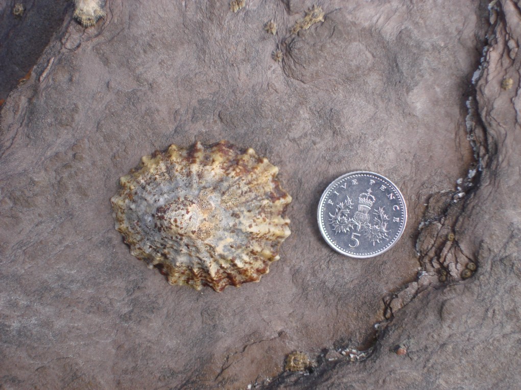 Common Limpet (Patella vulgate)- Found in large numbers at all levels of the tide line, they have a very strong muscular foot which it uses to stay attached to the rock which allows them to live in areas with strong wave action. They graze on algae and micro-organisms that grow and live on the rock surface. They return each day to what is known as a ‘home scar’ which they create using their shell to cut into the rock.