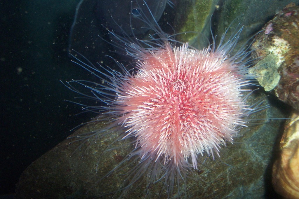 Edible Sea Urchin (Echinus esculentus)- Known locally as ‘Skaadman’s head’.A large urchin around 15-16cm in diameter, they are red in colour, although shade may vary. They are covered in pinkish white spines and when submerged soft tentacles are extended in rows alongside the spines. They have a hard bony ‘beak’ on their underside which they use to feed on algae and barnacles. They are scarce in rockpools but are often seen on piers and harbour walls. They are often found washed up on beaches, usually broken and with no spines left intact. They are known as the Edible Sea Urchin as the roe was eaten as a delicacy in some areas of the UK.