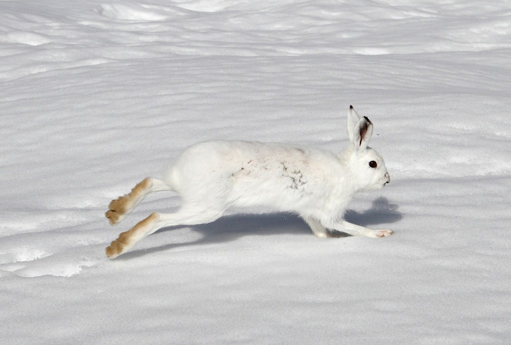 Mountain Hares are much bigger than rabbits with a head to body length of 50-65cm compared with the rabbits 35-45cm and of course they have the very distinguishable large ears. In summer, Mountain Hare’s fur is brown-greyish with a white belly but this changes to white or partially white in winter. The ears however always keep their black tips.