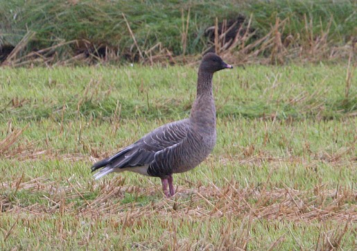 Identifying features- Smaller than Taiga Bean Goose and equal in size to Tundra Bean Goose but as its name suggests, they have pink legs in comparison to the bean geese (although this can be difficult to establish at a distance). They have a small, short, dark beak with a pink band, and a dark head and neck. Call similar to the bean geese species but of higher pitched ‘ca-ca-ca’ sound.