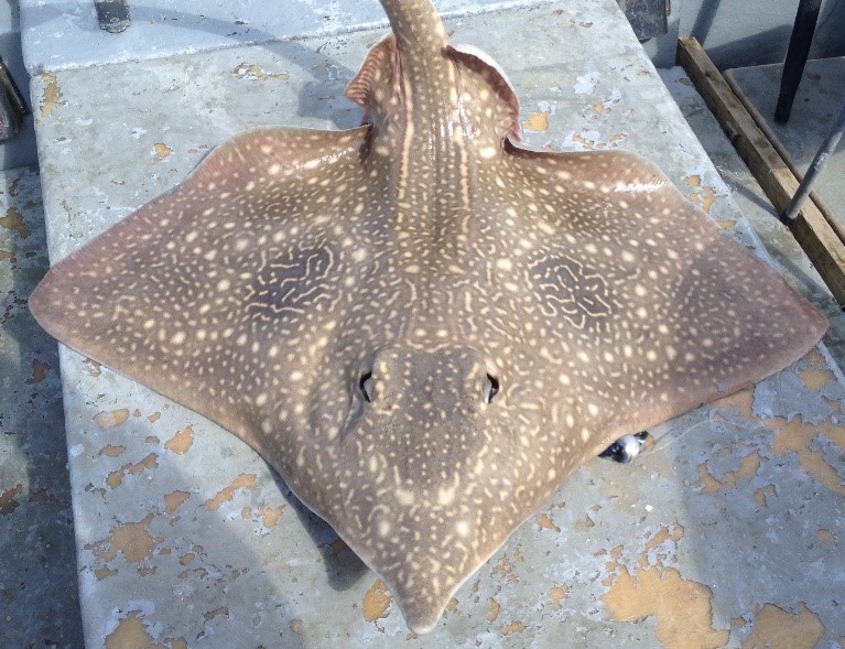 We have a range of batoides (skate and ray) in Scottish waters. Including the common skate which is one of the largest species in the world – it has a wingspan that can reach almost 3m. In recent years this species has been divided into 2 separate ones – flapper and blue, with the flappers being more common in our northern waters.