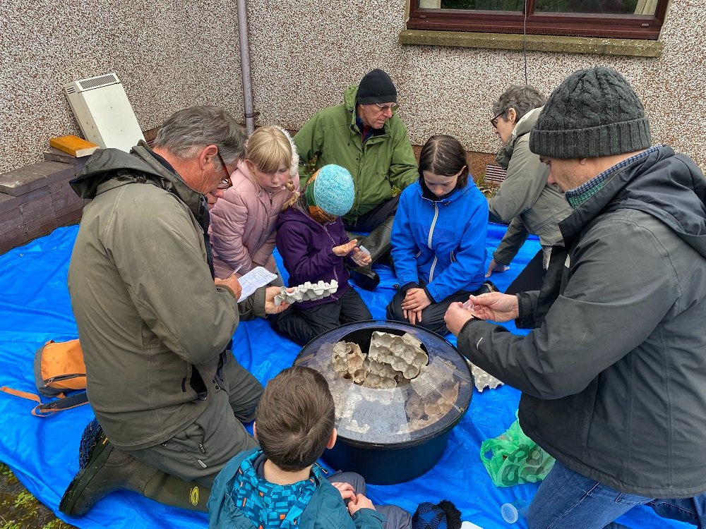Bairns hard at work identifying and recording moths. A total of 215 were trapped of 16 different species – not a bad haul for a damp, windy morning