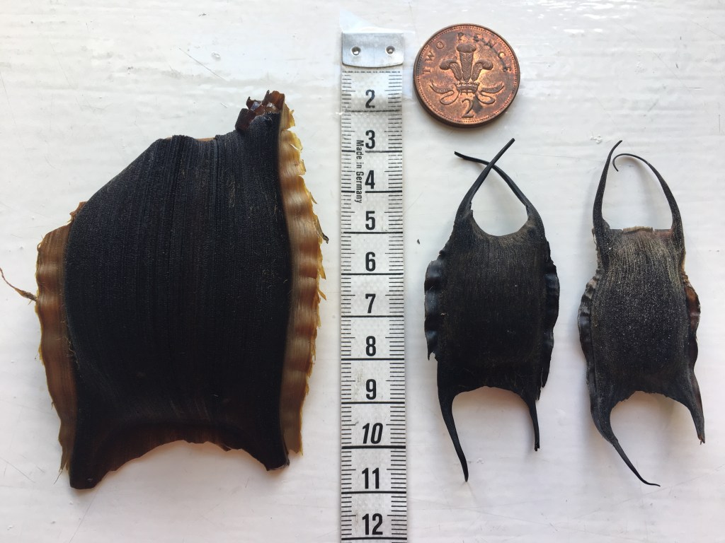 Sharks and skates each produce a slightly different eggcase. Once the young have hatched, the empty eggcases will often wash up on the coast. By submitting our sightings of the eggcases we find we can learn more about the species of sharks and skates around the local area. We work in collaboration with The Shark Trust to share records so that the data can help inform local and national datasets.