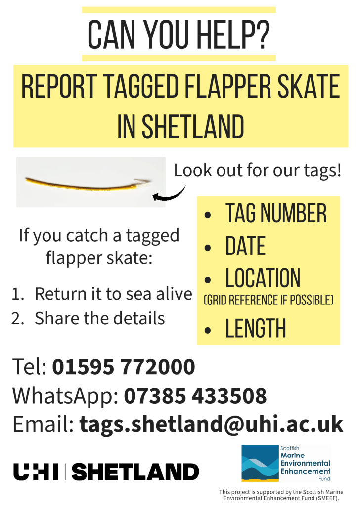 The Marine Science team at UHI Shetland were recently successful in securing funding from the Scottish Marine Environmental Enhancement Fund (SMEEF) to run a two-year project tagging Europe’s largest skate species, the flapper skate, in the seas around Shetland.